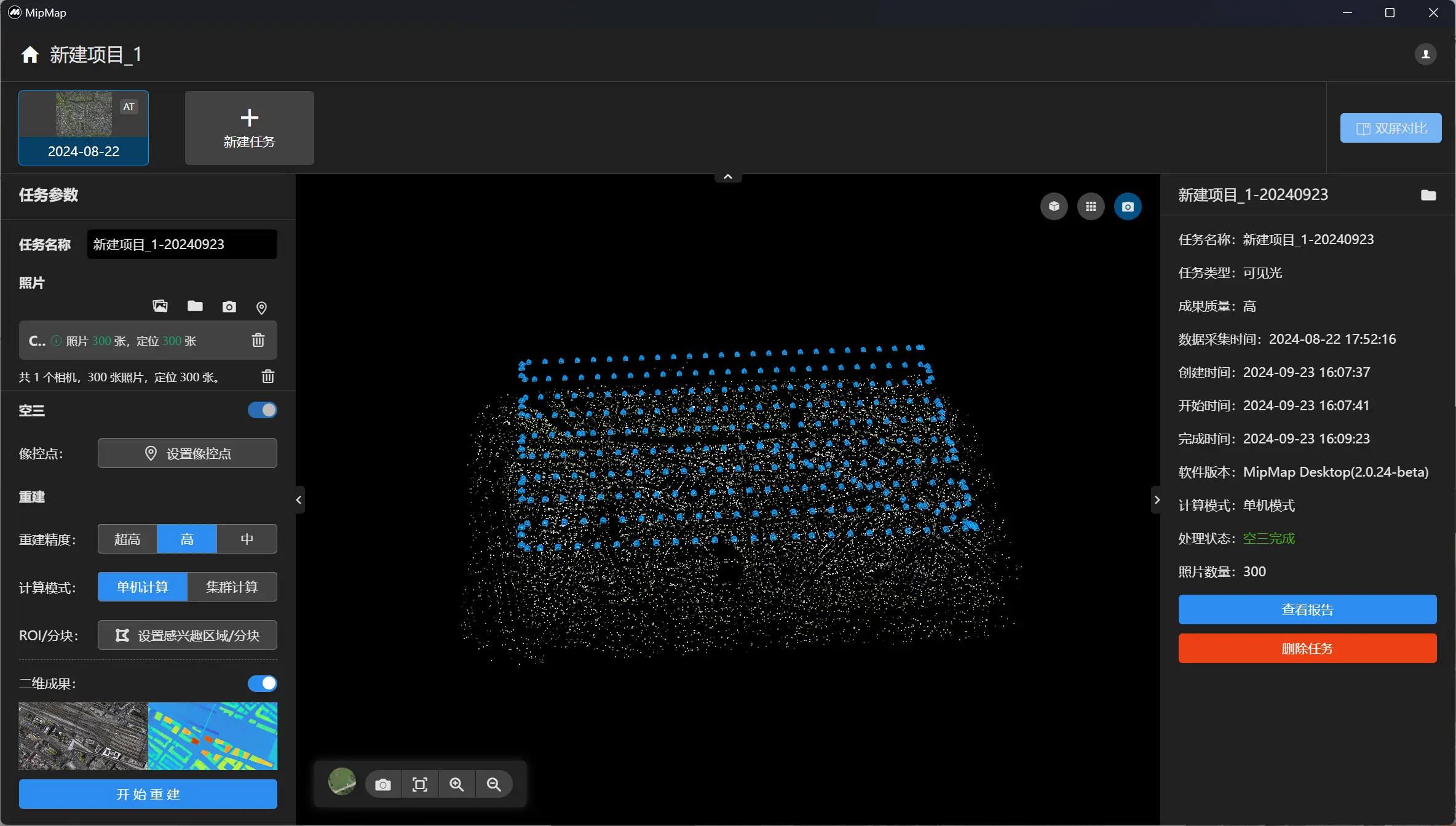 重建完成后会自动显示重建的成果,如果既有二维成果也有三维成果,可以点击地图页面左下角来切换2D和3D的显示的模式。左侧面板会显示成果列表,点击复选框可以切换不同的成果。