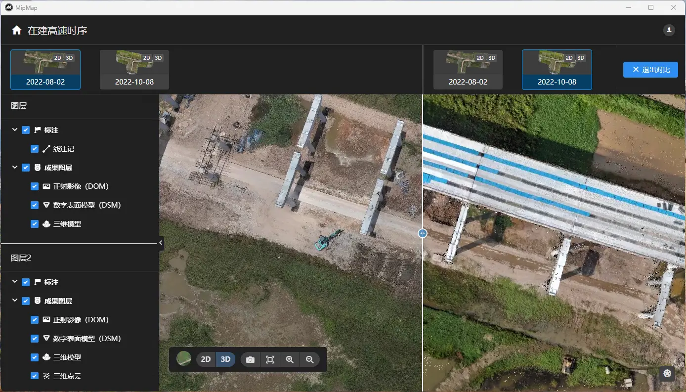 当一个项目下面有多个任务时,软件右上角的"双屏对比"按钮会呈现激活状态,点击"双屏对比",地图会进入对比状态。
